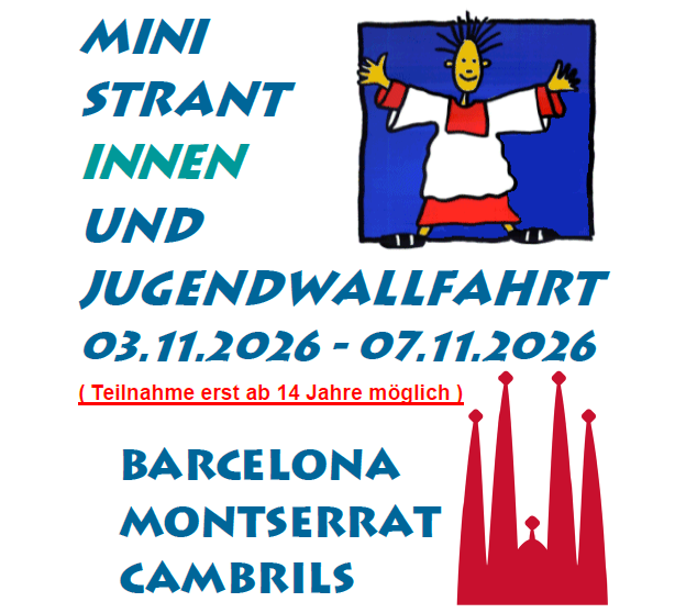 In den Allerheiligenferien bieten die Katholischen Gemeinden Zell-Leinach eine Fahrt nach Barcelona an. Eingeladen sind alle Ministranten und Jugendlichen aus dem Pastoralen Raum Würzburg Nord-West ab 14 Jahren.